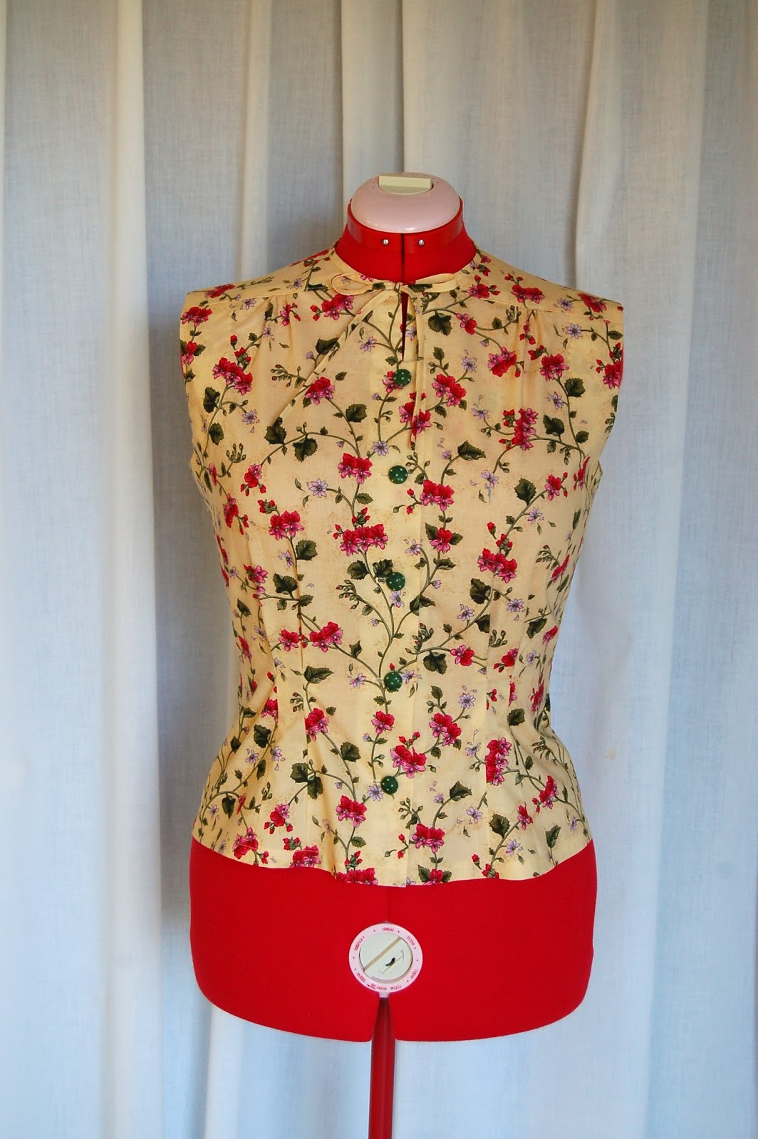 Next up is this cute '50s blouse that I made for a friend last summer. I had gotten the fabric on sale shortly beforehand, and it seemed like just the right print for her. I used a vintage blouse pattern in my stash, and whipped it up in no time.